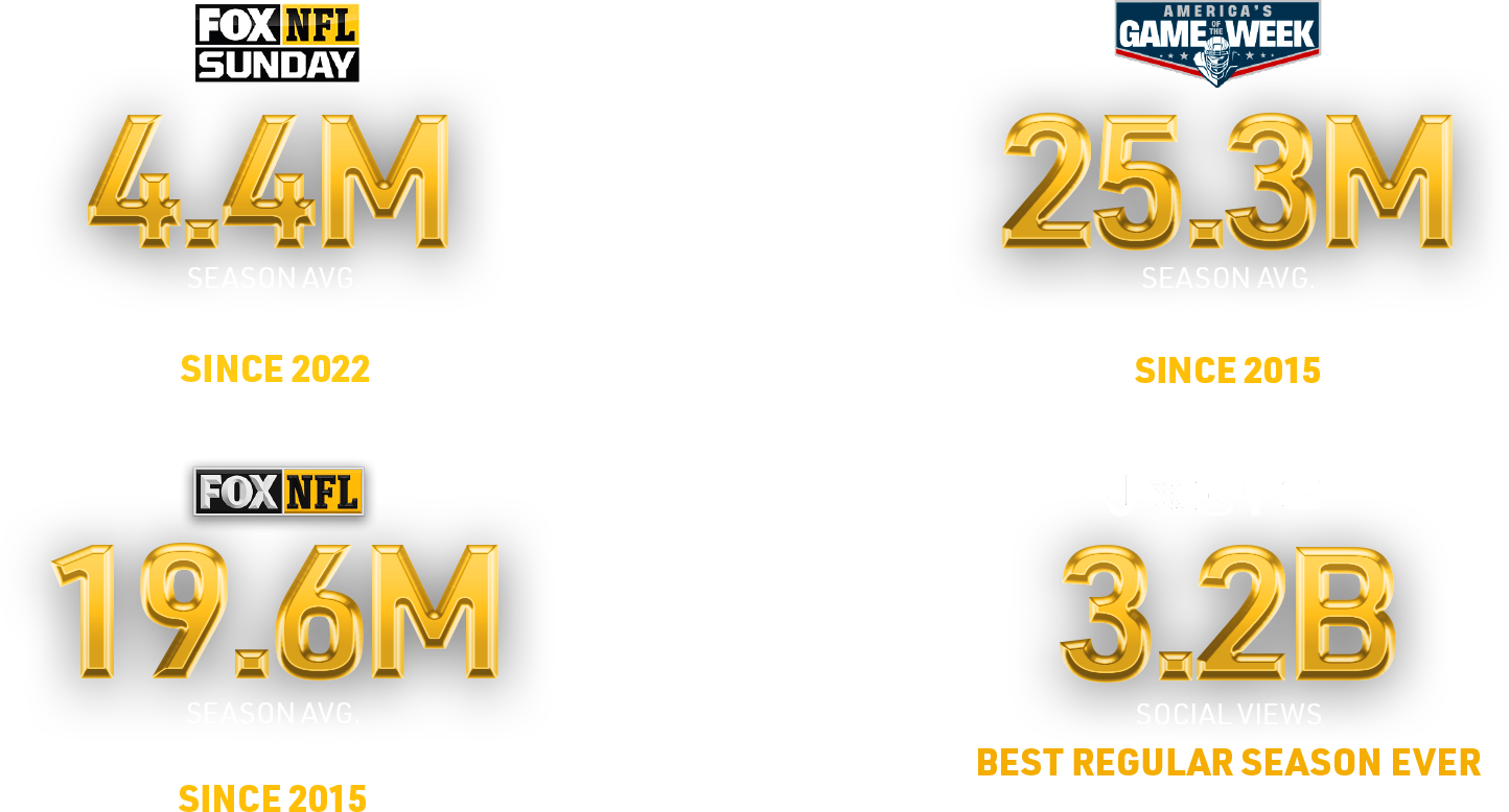 The NFL on FOX is the gold standard for Sunday football and beyond, delivering the biggest and most exciting matchups, exclusive access and insights, and a legendary roster of influential talent. Connect your brand with passionate, engaged audiences across every screen all season long.